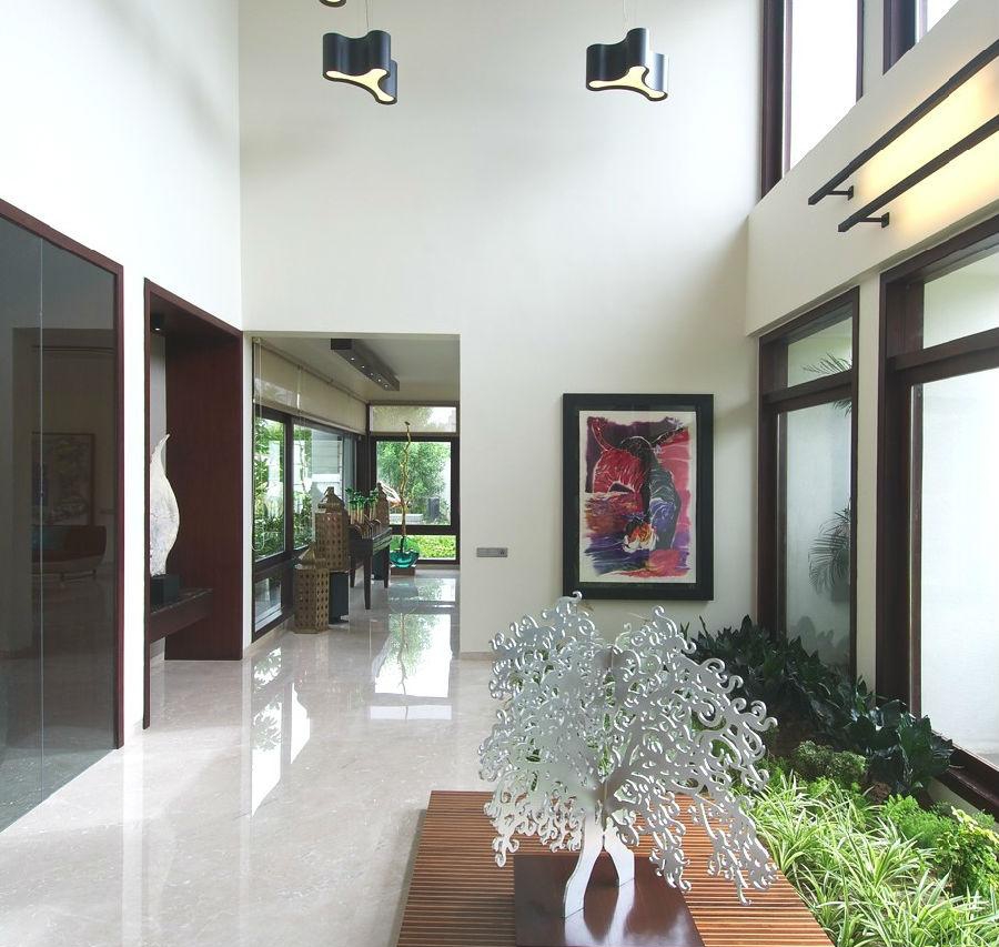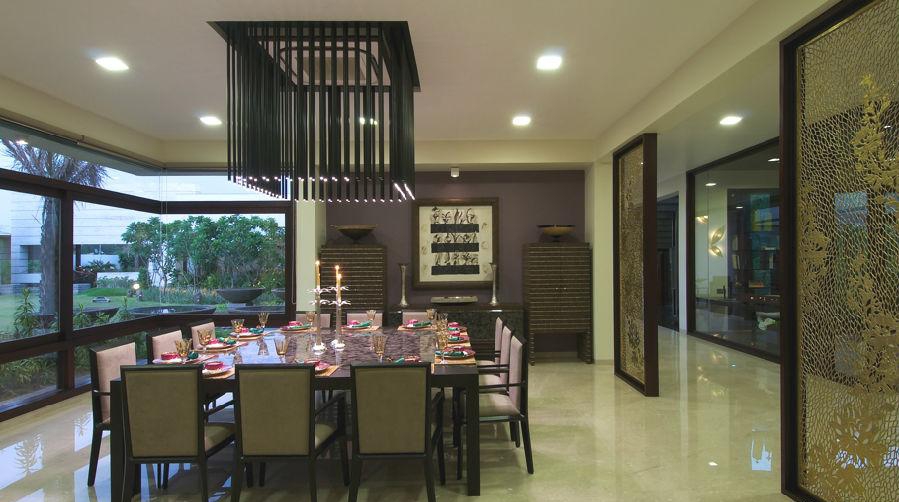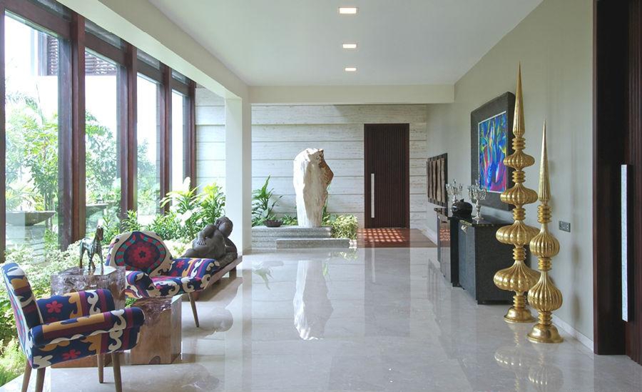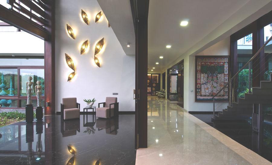 “室內設計是經過深思熟慮的,全部使用定制家具,注重設計的細節。內飾的顏色和裝飾品使用印度歡快的元素,期望給業主帶來一個歡樂的房子,打破清醒。原畫和藝術品空間的補充,更能體現“樊語”藝術”。